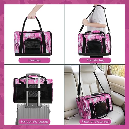 Pet Carrier TSA Airline Approved for,Cats and Dogs Under 18 Pounds,Cat Travel Carrier,with Honeycomb HRD Bottom,4 Mesh Windows Dog Carriers for Small Dogs,Cat Carrier Soft-Pink Camouflage